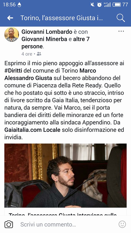 Dopo avere chiarito che, contrariamente a quanto scritto da sedicenti organi di stampa locali, “non esistono costi né diretti né indiretti per le amministrazioni aderenti” e che l’impegno “e la partecipazione alle iniziative” di Rete Ready “è lasciata alla discrezione dei partner, in considerazione delle risorse a loro disposizione” – quindi non ci sono costi fissi, ma costi sì – Marco Giusta esprime a nome dell’amministrazione torinese la “disponibilità a fornire ove necessario qualunque chiarimento in merito alla rete Ready oltre quelle già espresse” e quindi a “titolo personale” esprime “vicinanza e sostegno” alle associazioni LGBTQI di Piacenza che hanno indetto per il 14 ottobre una manifestazione cittadina contro le discriminazioni. Dunque ci chiediamo se il comunicato, quindi l’intervento in esso pubblicato, inviato da Giusta sia stato inviato a titolo personale o come rappresentante dell’Amministrazione di Torino. Sarebbe bello avere una risposta in merito.
