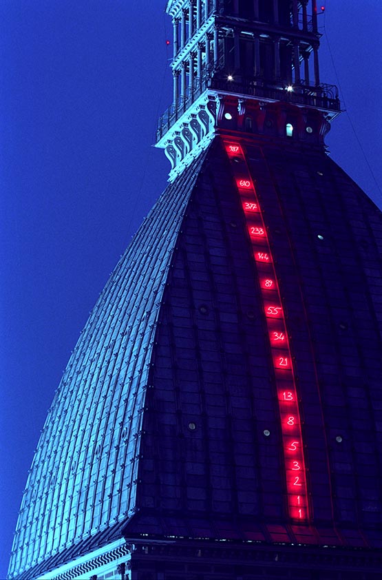 Leggi l'articolo →L’artista ha più volte utilizzato la serie di Fibonacci come elemento delle sue installazioni; allo stesso modo, è stato fra i primi ad assumere la luce fluorescente come metafora dell’energia. Qui, però, la successione numerica assume nuovi significati sia come forte segnale luminoso disposto sulla Mole, sia in rapporto alla curva (altro schema di frequente utilizzazione matematica) della cupola della costruzione di Antonelli.