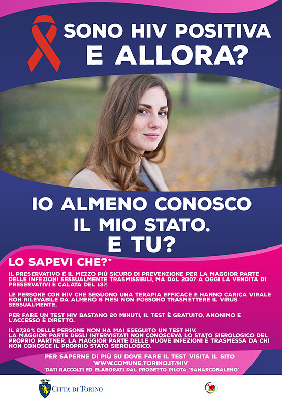 La Città di Torino, sulla base di dati regionali e di quelli provenienti dal Progetto “Sanarcobaleno” dell’Odv Casa Arcobaleno, vincitrice del bando indetto dal servizio Pari Opportunità e Diritti, ha realizzato una campagna volta a combattere lo stigma delle persone sieropositive dal titolo “Sono HIV positivo/a, e allora?”. Il messaggio, volto a conoscere il proprio stato sierologico e accettarlo serenamente, è importante ed essenziale per combattere in maniera efficace lo stigma. La comunicazione verrà diffusa a partire dal sito della città www.comune.torino.it/hiv e su manifesti di grandezza 200 x 140 che saranno affissi in 220 spazi dedicati a partire dalla prossima settimana.