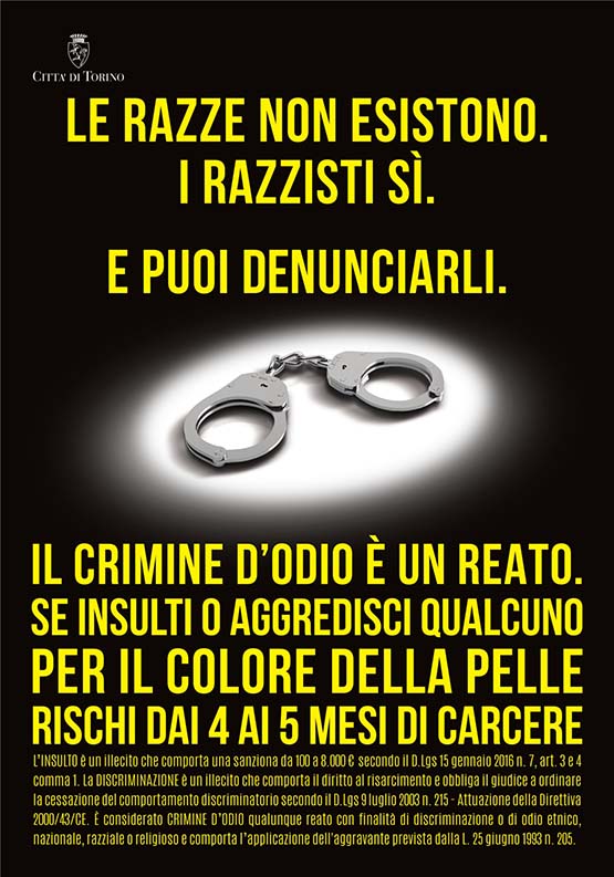 “Il Razzismo non è un’opinione – è un crimine” è la campagna di comunicazione che l’Assessorato comunale ai Diritti e alle Pari Opportunità ha avviato da oggi, per sensibilizzare la cittadinanza sul tema dell’odio razzista. La campagna si inserisce nelle più ampie attività del Progetto europeo G3P Reloaded, con partner internazionali e locali, che mira a contrastare i crimini d’odio razzisti e ad aumentare il numero di denunce. Una campagna che, continua l’assessore Giusta, è “rivolta anche alle persone che sono a rischio di episodi di razzismo”.