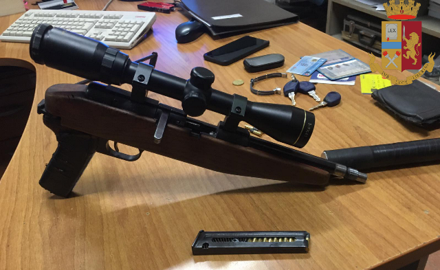 Alla guida dell’auto vi erano un quarantaquattrenne e un ventiduenne. Sul sedile posteriore dell’auto è stata rinvenuta un’arma di fabbricazione artigianale, sprovvista di marca e matricola, corredata di un silenziatore pur’esso di fattura artigianale. L’arma era altresì munita di una gruccia pieghevole in ferro, di un cannocchiale ed aveva il caricatore monofilare inserito, carico di cartucce. Altre cartucce analoghe sono state rinvenute nel giubbotto del quarantaquattrenne. All’interno dell’auto è stato anche rinvenuto un bastone ed una trappola (tagliola) in ferro.