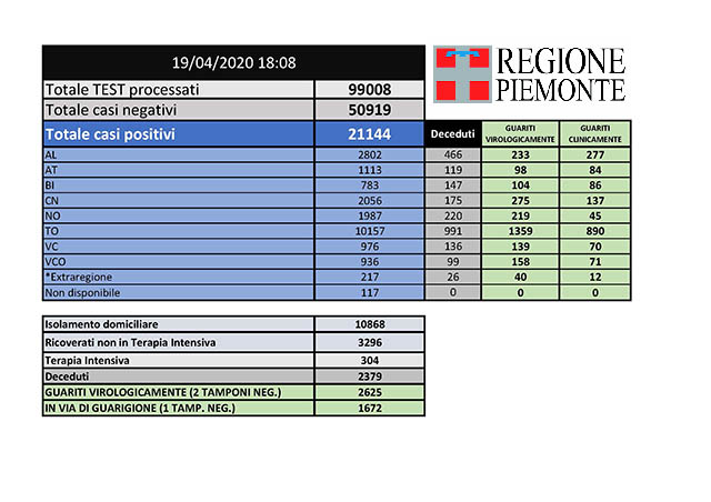 I contagi sono 21.144 (+563 rispetto a ieri), le persone finora risultate positive al “Covid-19” in Piemonte: 2.802 in provincia di Alessandria, 1.113 in provincia di Asti, 783 in provincia di Biella, 2.056 in provincia di Cuneo, 1.987 in provincia di Novara, 10.157 in provincia di Torino, 976 in provincia di Vercelli, 936 nel Verbano-Cusio-Ossola, 217 residenti fuori regione ma in carico alle strutture sanitarie piemontesi. I restanti 117 casi sono in fase di elaborazione e attribuzione territoriale.