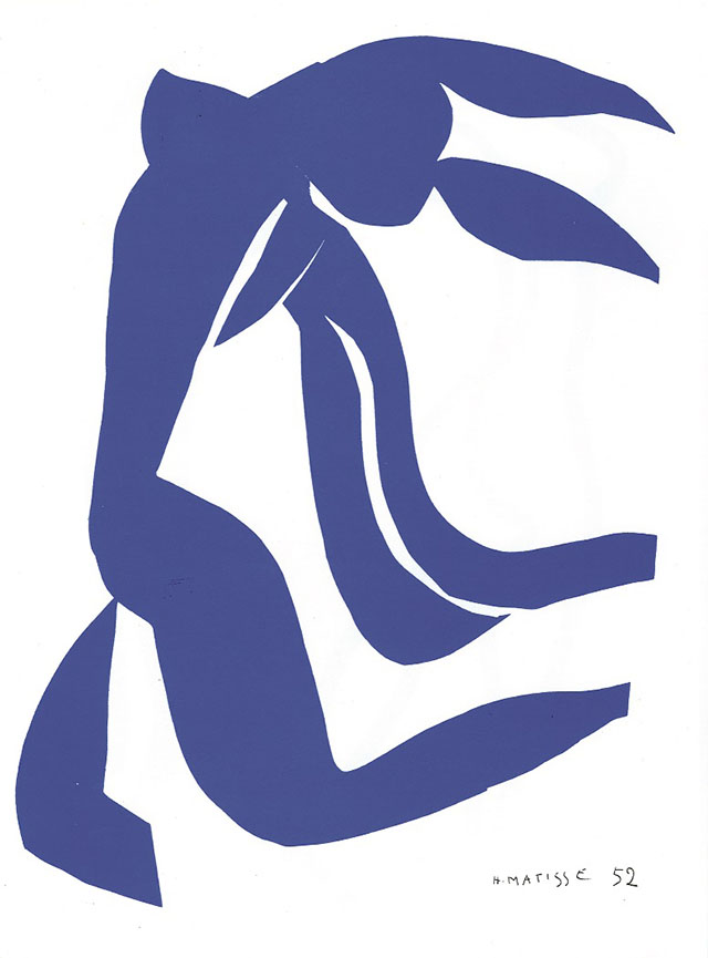 La serie dei Nudi Blu porta all’estremo il nuovo concetto di pittura di Matisse: quello di dipingere direttamente nel colore ritagliando pezzi di carta in forme differenti. In questo caso si tratta di figure femminili, tutte di colore blu. Silhouettes ritmate, essenziali e astratte. Figure dalle movenze eleganti e sinuose, che talvolta evocano donne di mondi lontani, con un chiaro richiamo all’arte africana. Un aspetto che ritroviamo ad esempio nel Nu Bleu VI.