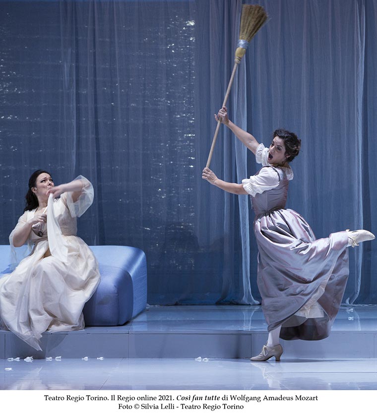 Il cast pare “cucito” sulla musica e le intenzioni del compositore e indubbiamente si sposa all’idea registica. Eleonora Buratto, tra i soprani lirici più acclamati del mondo, inizia la sua carriera proprio con il Maestro Muti e ha al suo attivo collaborazioni con i più importanti direttori della scena internazionale, da Zubin Mehta a Teodor Currentzis, da Daniele Gatti a Michele Mariotti. Questa è la sua seconda prova nel ruolo di Fiordiligi, già sostenuta con gran successo al Teatro alla Scala lo scorso gennaio. Paola Gardina (Dorabella) è fra i mezzosoprani più talentuosi del panorama italiano e straniero. Ha calcato i palcoscenici dei più importanti teatri al mondo, dal Teatro alla Scala alla Bayerische Staatsoper, dalla Fenice al Teatro Real di Madrid. Del suo personaggio racconta: «Io e Dorabella siamo “amiche”, ormai in me c’è qualcosa di lei. È un personaggio frizzante, sbarazzino e fresco, una ragazza che racconta una storia di sentimenti che nei secoli si ripete immutata e sempre attuale». I due ufficiali Ferrando e Guglielmo sono interpretati rispettivamente da Giovanni Sala e Alessandro Luongo. Il primo colpisce per la voce e l’interpretazione appassionata, il calore, la sensibilità e lo slancio con cui delinea i personaggi. Proveniente da una famiglia di musicisti, la musica è stata per Giovanni Sala il primo respiro e oggi lo possiamo anche apprezzare nelle sue esibizioni con il Gruppo vocale Famiglia Sala. Alessandro Luongo, classe 1978, è fra i baritoni più promettenti della sua generazione: ha collaborato con prestigiosi direttori quali Riccardo Muti, Zubin Mehta, Fabio Luisi, Michele Mariotti, Seiji Ozawa, Bruno Campanella ed Evelino Pidò, e con registi come Pier Luigi Pizzi, Jean-Louis Grinda, Cristina Mazzavillani, Ruggero Cappuccio. Il giovanissimo mezzosoprano Francesca Di Sauro debutta il ruolo di Despina. Ha già al suo attivo collaborazioni con il Maestro Riccardo Muti e con artisti come Leo Nucci e registi come Emma Dante. Marco Filippo Romano è uno splendido Don Alfonso, tra i più amati baritoni buffi della scena internazionale, ed è un habitué del palcoscenico torinese, dove è stato interprete con grande successo ne L’italiana in Algeri, Il barbiere di Siviglia, Il turco in Italia, La donna serpente, La Cenerentola, Turandot e Il matrimonio segreto.