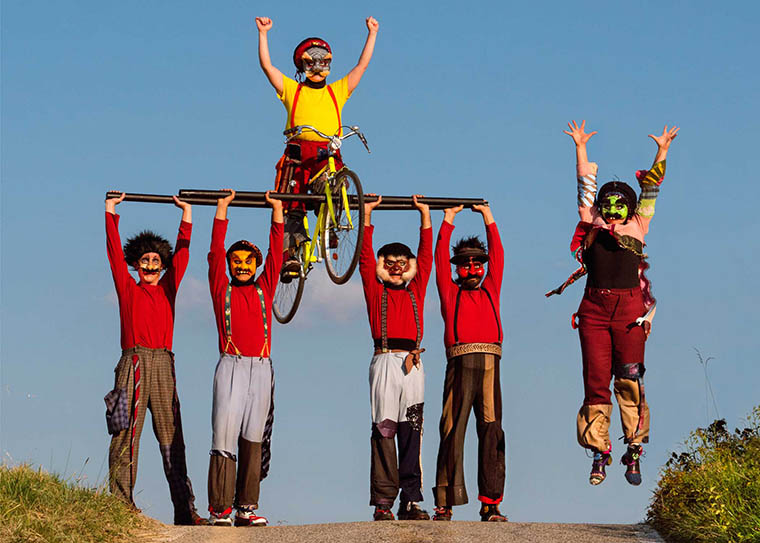 Nello spettacolo sei mirabolanti personaggi in maschera pedalano con gli stendardi al vento sulle loro biciclette gialle!