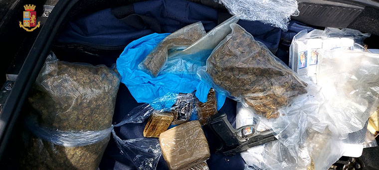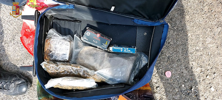 Dopo aver rintracciato la donna all’esterno dell’abitazione questa, poco collaborativa, alzava la voce per allertare i familiari presenti in casa della presenza della polizia. Gli agenti hanno raggiunto il primo piano della palazzina per effettuare una perquisizione domiciliare che però è stata ostacolata prima dal marito, che era uscito sul pianerottolo, anche lui poco collaborativo ed in stato di agitazione, poi dai figli della coppia che si trovavano in casa e che sono riusciti a chiudere la porta dall’interno. Dallo spioncino è stato possibile osservare i movimenti dei due ragazzi che sono stati visti mentre andavano verso il balcone con un borsone in mano, successivamente recuperato dopo che è stato consegnato agli agenti da un vicino di casa che lo ha trovato sul suo balcone, probabilmente dopo essere stato lanciato dai due giovani che erano stati visti avvicinarsi al balcone del vicino da altro personale appostato sul retro dello stabile. I poliziotti, dopo essere riusciti ad entrare in casa, hanno trovato i due ragazzi seduti sul divano. La perquisizione, avvenuta anche in un altro appartamento dello stabile di proprietà del nonno dei ragazzi ed al momento sfitto, è stata effettuata anche con l’ausilio di una unità cinofila antidroga ed ha permesso di rinvenire 5.126 grammi di hashish e 1.483 grammi di marijuana suddivisi in svariati involucri e panetti oltre al materiale per il confezionamento e la somma totale di 14.225 euro, tutto ritenuto correlato all’attività illecita. Inoltre sono state trovate 2 scatole contenenti in totale 9 cartucce artigianali, 5 cartucce a salve ed un bossolo.