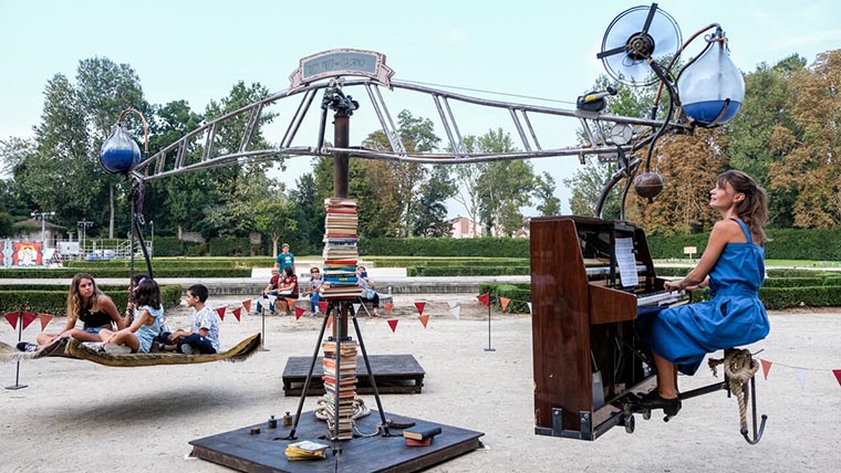 “La dinamica del controvento” è un carosello musicale con in scena al pianoforte Irene Michailidis: un’installazione di ferro, vecchi libri e damigiane, il cui meccanismo è concepito come una delle giostre del tempo che fu, ma con un magico potere in più: portare la musica classica per le strade, le piazze, le fiere, i festival e gli eventi nello spazio pubblico di tutta Italia, coinvolgendo e affascinando spettatori di tutte le età. ll carosello musicale accoglie il pubblico del suo breve concerto per pianoforte di pochi minuti su un tappeto da “Le mille e una notte”, che gira a mezz’aria, sospinto dalla melodia di alcuni celebri brani che hanno fatto la storia della musica.