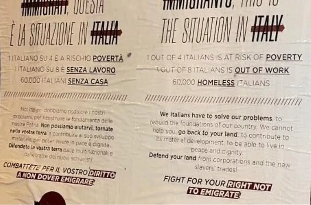 “Questa è la situazione in Italia – si legge sui manifesti – un italiano su 4 è a rischio povertà, non possiamo aiutarvi; tornate nella vostra terra a contribuire al suo sviluppo materiale per poter vivere in pace e dignità. Combattete per il vostro diritto a non dover emigrare”.