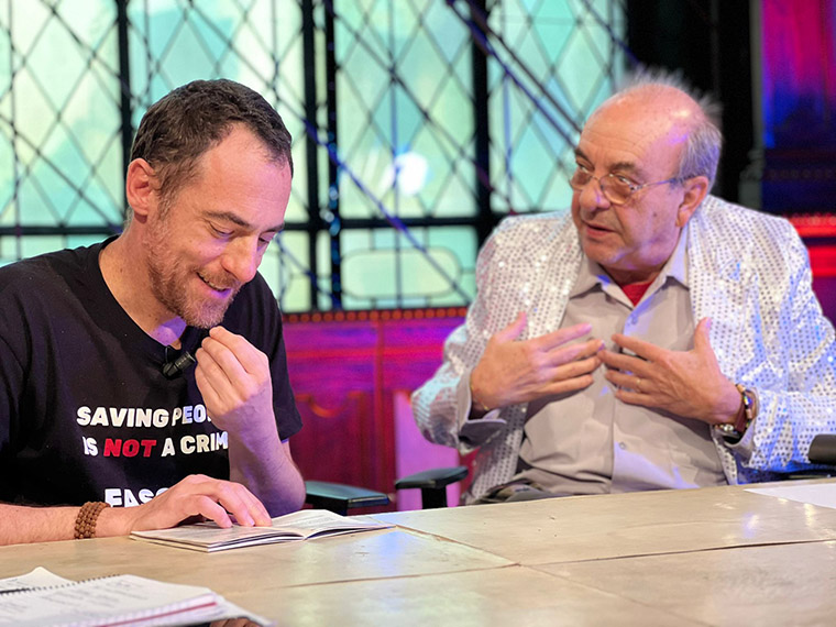 “L’Italia è una Repubblica democratica fondata sul lavoro” e non sulla ricchezza, legge e poi commenta Elio Germano, ospite del suo Vauro Show, il contenitore satirico in onda sull’APP di Servizio Pubblico, progetto editoriale di Michele Santoro. “Sei venuto con una maglietta scritta in inglese perché così speri che non si capisca? Quelli della Lega non la capiscono”, ironizza il vignettista rivolgendosi all’interprete da sempre in prima linea per i diritti delle persone come per quelli degli artisti.