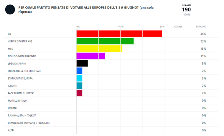 A pochi giorni dal divieto di pubblicare sondaggi, quindici giorni prima delle elezioni europee, ci piaceva l’idea di conoscere l’orientamento di voto di lettrici e lettori dei nostri quotidiani. Centonovanta di voi – grazie – hanno accettato di rispondere al questionario. Si tratta, naturalmente, di un sondaggio che ha una funzione conoscitiva del nostro pubblico, i cui dati sono pubblicati così come li abbiamo ricevuti, ma non ne vendiamo l’attendibilità statistica, perché non abbiamo seguito un metodo scientifico.