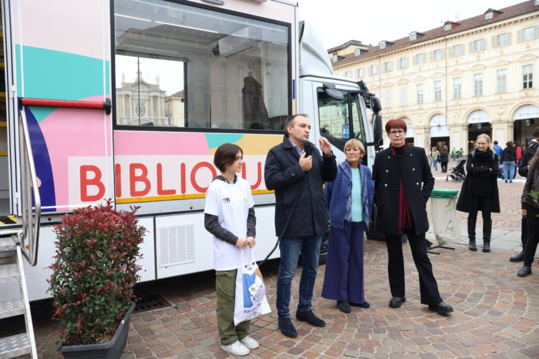 Inaugurato sabato 12 in piazza San Carlo il nuovo Bibliobus delle Biblioteche civiche della Città, in uno speciale allestimento dedicato ai temi della legalità in occasione della prima giornata di Portici di Carta.
