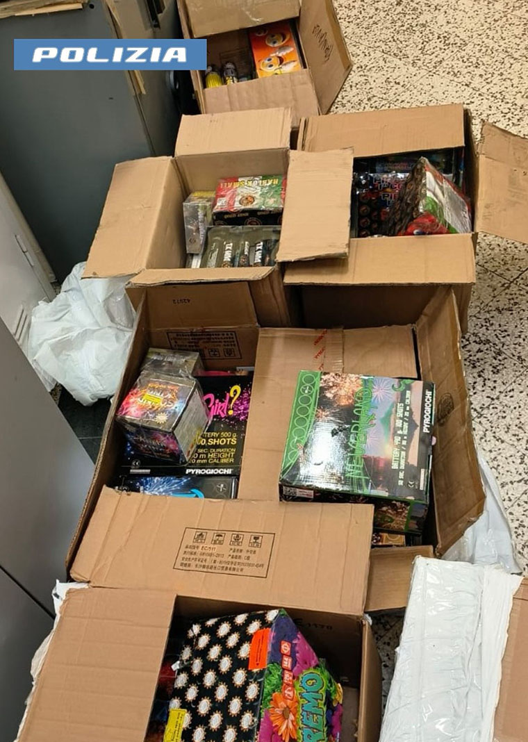 Sul posto, gli agenti hanno documentato l’arrivo di un corriere che depositava due voluminosi pacchi contenenti materiale esplodente di categoria F2 dal peso complessivo di circa 33 kg lordi. Nel garage dello stabile interessato, adibito a rimessa per i mezzi di trasporto, i poliziotti hanno rinvenuto ulteriori scatole colme di artifici pirotecnici della stessa categoria, pari a oltre 100 kg lordi. Il materiale esplodente si trovava molto vicino a una cisterna di gasolio, luogo altamente rischioso per la custodia del materiale stesso.